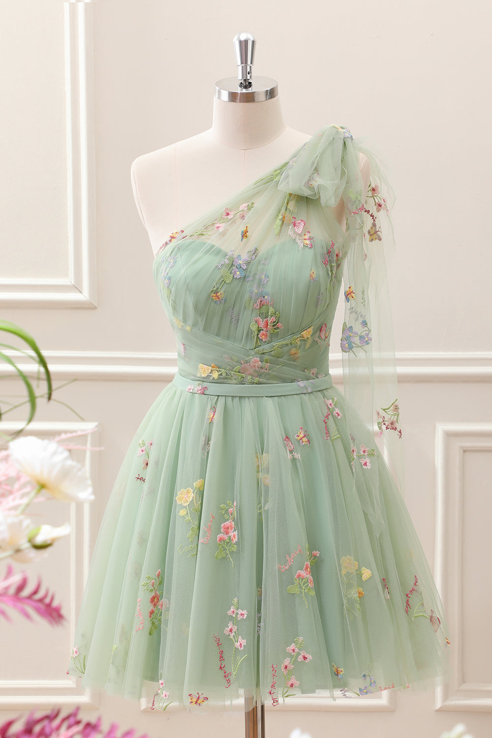 Cute Light Green A Line Tulle One Shoulder Floral Embroidery Mini Dress