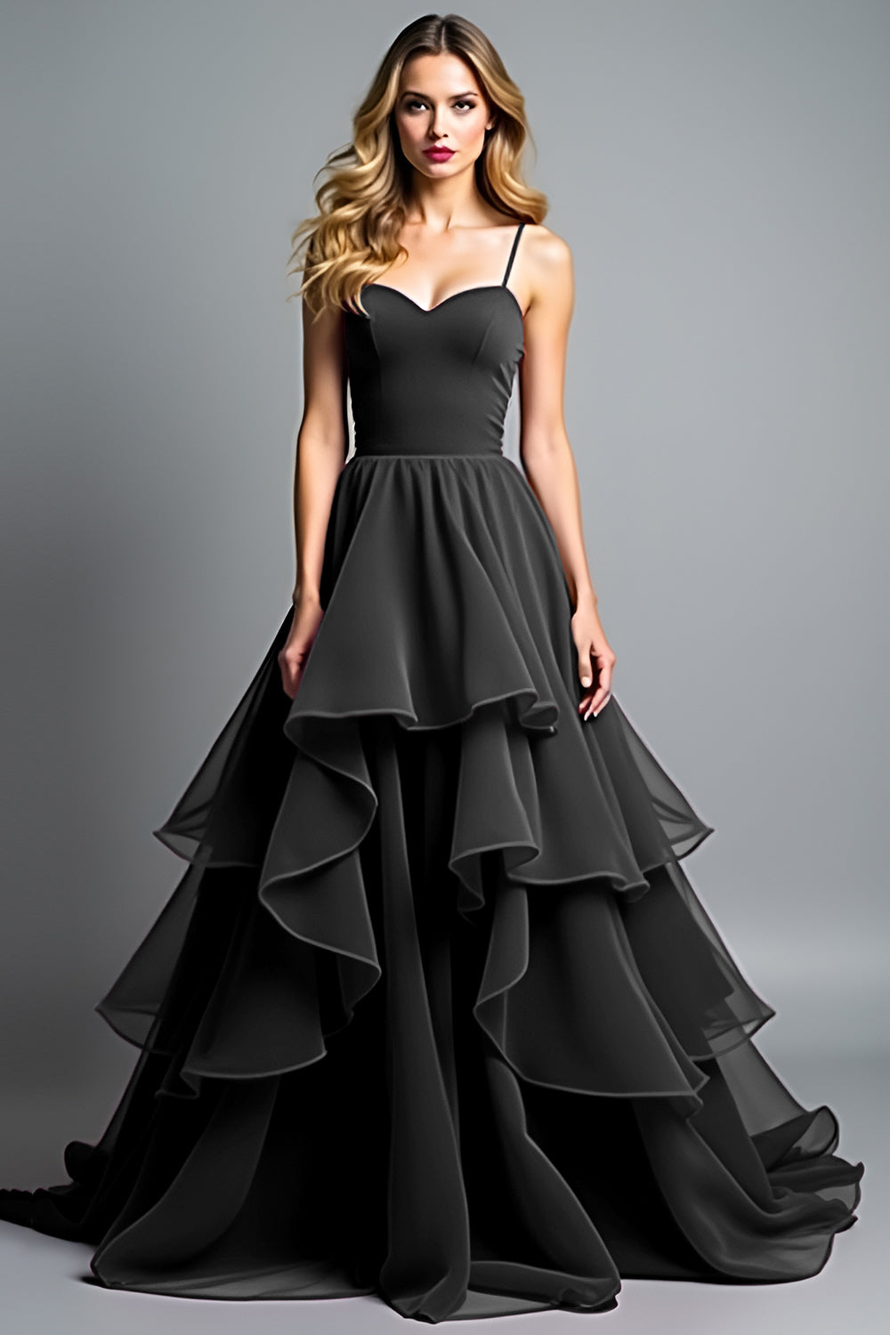 A Line Tiered Ruffled Spaghetti Straps Black Tie Dress